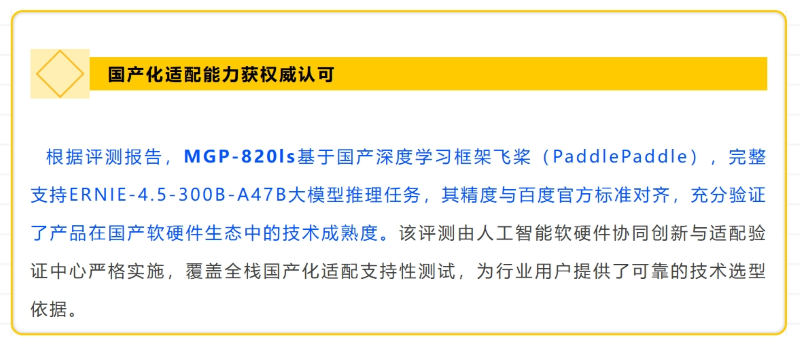 根據(jù)評測報告,MGP-820ls基于國產(chǎn)深度學(xué)習(xí)框架飛槳(PaddlePaddle),完整支持ERNIE-4.5-300B-A47B大模型推理任務(wù),其精度與百度官方標準對齊,充分驗證了產(chǎn)品在國產(chǎn)軟硬件生態(tài)中的技術(shù)成熟度。該評測由人工智能軟硬件協(xié)同創(chuàng)新與適配驗證中心嚴格實施,覆蓋全棧國產(chǎn)化適配支持性測試,為行業(yè)用戶提供了可靠的技術(shù)選型依據(jù)。