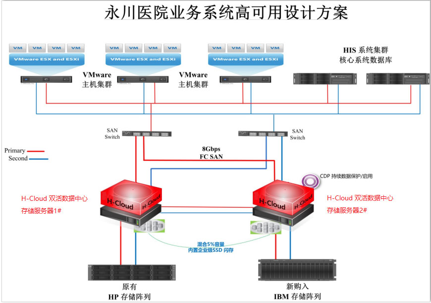 H-Cloud 致力于全球的存儲(chǔ)安全解決方案,受益于虛擬化技術(shù), 能夠整合永川數(shù)據(jù)中心不同特征的存儲(chǔ)陣列,包括已經(jīng)在用的 DAS 及 SAN,并且在跨異構(gòu)的模式下,為永川醫(yī)院核心業(yè)務(wù),OA 業(yè)務(wù), 外網(wǎng)業(yè)務(wù)提供高可用性,使 RPO,RTO 目標(biāo)為零。