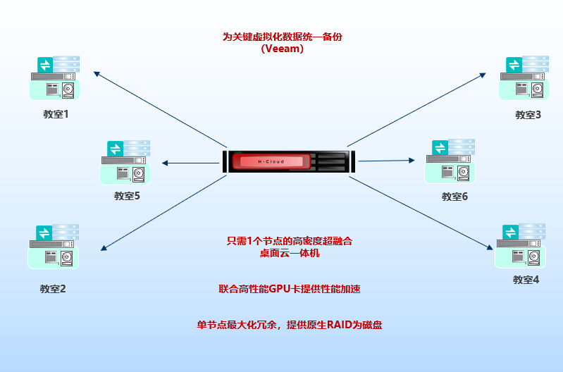 方案基于H-Cloud 超融合平臺(tái),1臺(tái)普通服務(wù)器通過(guò)超融合軟件,最終實(shí)現(xiàn)高密度VDI。