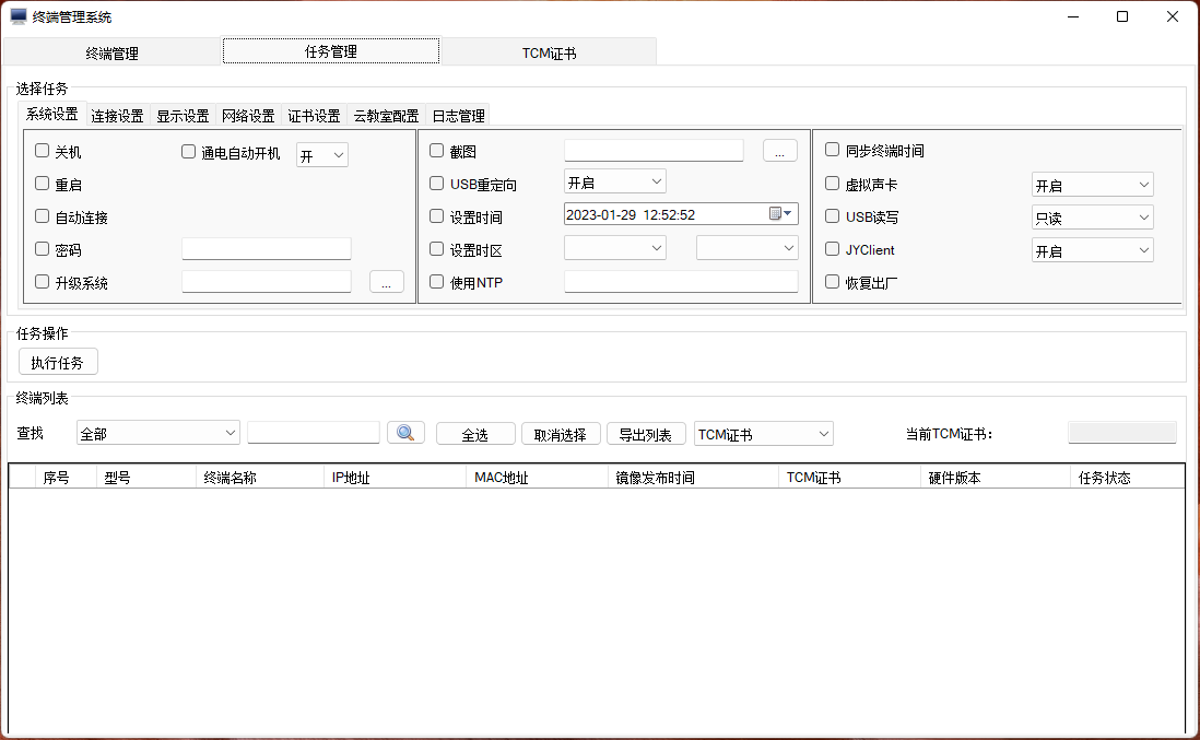 通過云終端管理系統(tǒng),勾選,關(guān)機(jī),重啟等任務(wù)之后,在終端列表里選取需要操作的終端,點(diǎn)擊執(zhí)行任務(wù)即可后臺統(tǒng)一控制。