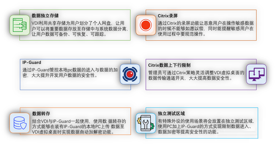 Citrix可以提供整體架構安全加固設計,從接入前,接入中,接入后多重維度來進行安全保障,但是對于終端和云桌面數(shù)據(jù)交互部分是缺少更顆?;墓芸?。