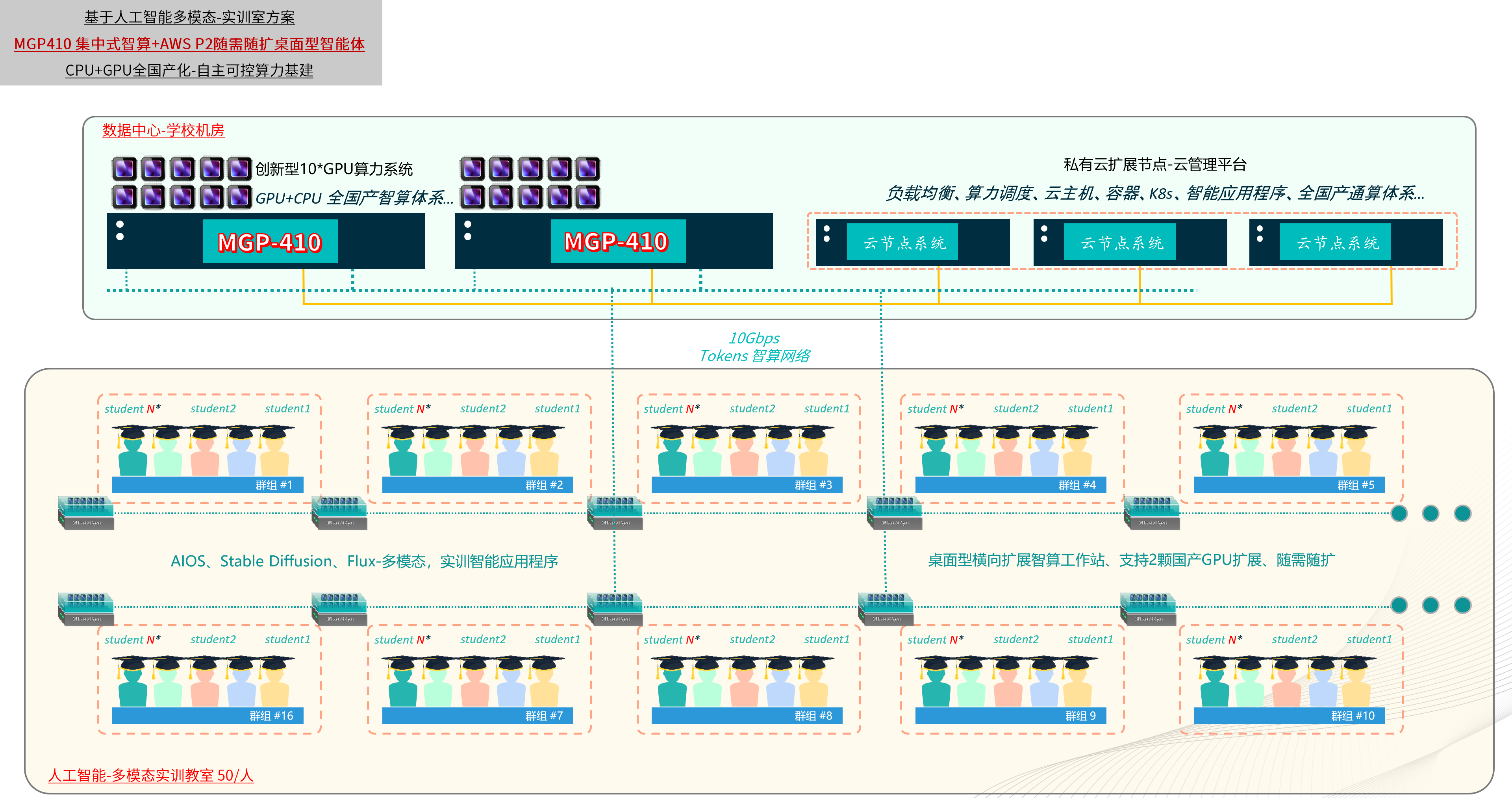 10臺AWS-P2可與MGP-410設(shè)置統(tǒng)一的算力集群,通過安裝在通算融合架構(gòu)的MaaS集中GPU算力調(diào)度平臺,提供統(tǒng)一管理的便捷性。AWS-P2直接可使用1Gbps組網(wǎng),方便在實訓(xùn)教室進行部署,之后上行端口統(tǒng)一配置多個10Gbps到數(shù)據(jù)中心,可采用單模光纖以太網(wǎng)。