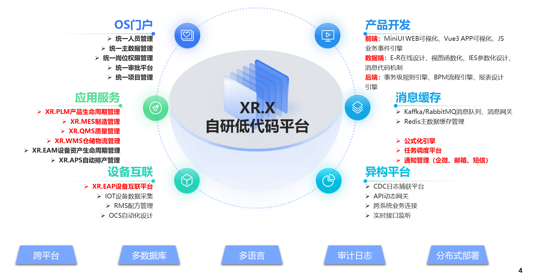 ?自研XR.X低代碼平臺是企業(yè)最佳智能制造流程的執(zhí)行平臺,全面貫徹 “軟件定義制造” 的理念,以數(shù)據(jù)驅(qū)動實現(xiàn)大規(guī)模個性化定制生產(chǎn)模式的落地。企業(yè)可通過XR.X平臺的核心產(chǎn)品構(gòu)建“可追溯性、智訊化、場景化的數(shù)字化整體解決方案”。曉軟 XR-X 平臺產(chǎn)品秉承穩(wěn)定、彈性、高效、開放、易維護(hù)設(shè)計核心理念,集成微服務(wù)化彈性系統(tǒng)架構(gòu)、開放且一致性開發(fā)平臺、通用接口系統(tǒng)輕松整合、類低代碼二次開發(fā)環(huán)境、積木式的核心系統(tǒng)框架、開箱即用營運管理平臺6大核心優(yōu)勢。