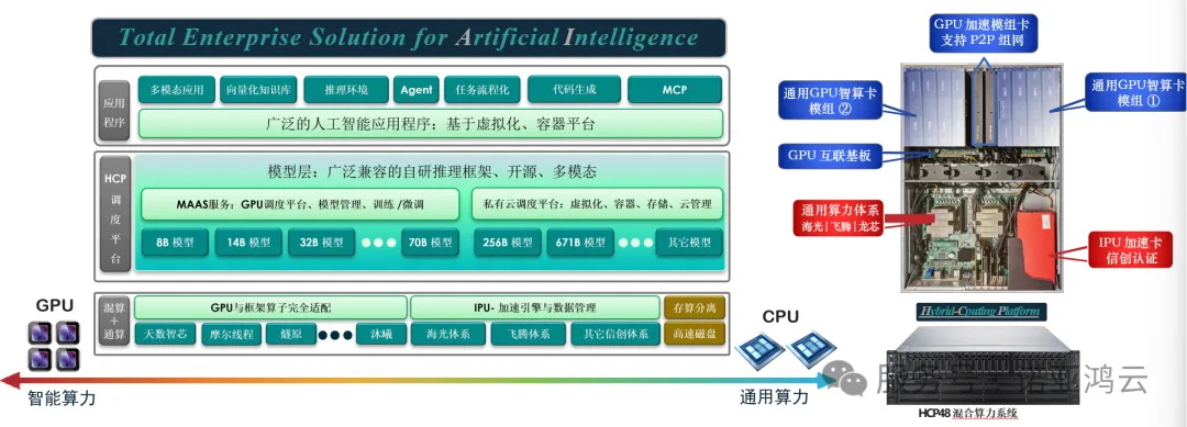 混合算力系統(tǒng)具備構(gòu)建完整人工智能應用所需的配套環(huán)境。 為復雜的AI應用程提供性能強大的虛擬化,容器等環(huán)境。而以GPU為核心的智算池也耦合在同一系統(tǒng)。支持混合算力的分布式部署,通過橫向擴展,具備構(gòu)建高可用性的大型GPU智算組網(wǎng)的能力