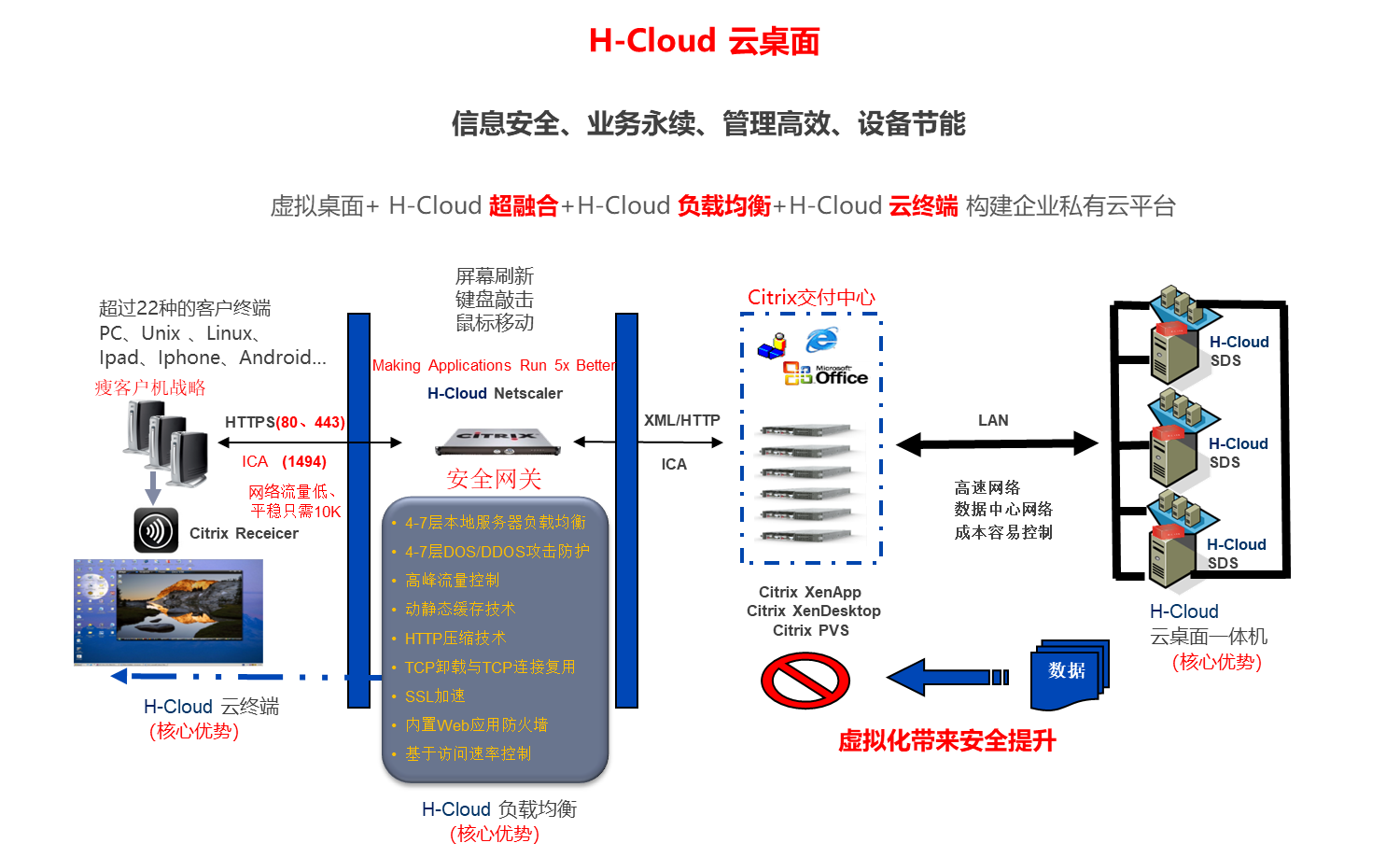 深圳市諾亞鴻云信息技術(shù)有限公司作為H-Cloud產(chǎn)品中國區(qū)核心戰(zhàn)略合作伙伴,在基于H-Cloud超融合平臺(tái)上,集成高密度云桌面系統(tǒng)。完美解決傳統(tǒng)桌面云無法解決的2大痛點(diǎn):